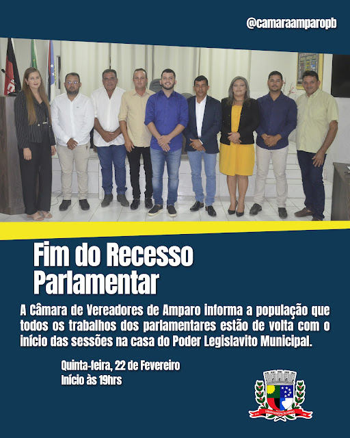 A Câmara Municipal Amparo retomará as sessões parlamentares nesta quinta-feira (22/02), a partir das 19hrs, no plenário Poeta José Marcolino. O presidente da Casa, vereador Flávio Messias convida toda a população amparense para estar presente acompanhando a volta dos trabalhos parlamentares.